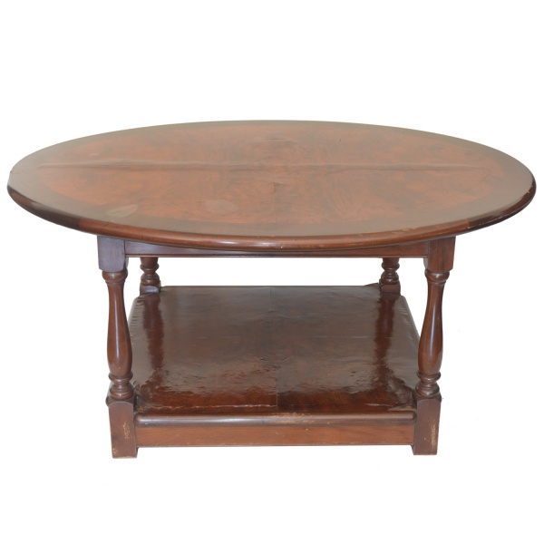 • Mesa de apresentação em madeira nobre, com tampo oval e borda canelada. Caixa retangular lisa com pés retos e torneados, ornados por anelados, e apoiados na base sobre plateau inferior alto com borda retilínea e pequenos pés. 52 x 110 x 80 cm. Tampo com manchas e folha solta. No estado.
