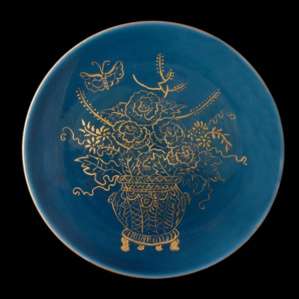 • CHINA; Séc. XIX - Prato circular em porcelana chinesa brilhante. Design floral com vaso e borboletas em estilo oriental sobre fundo azul cobalto.