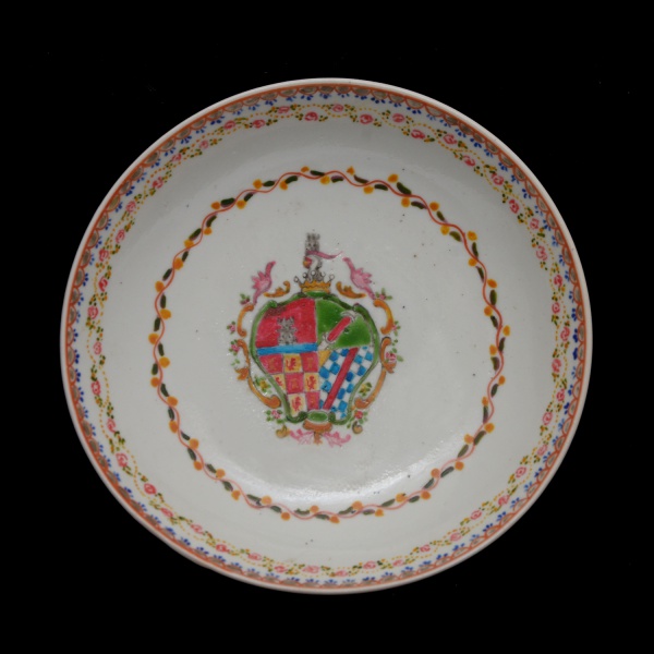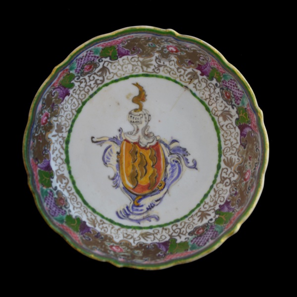 • PEDRO ÁLVARES DE ABREU E SOUZA. Governador do Rio de Janeiro em 1775  Pires em porcelana chinesa da Companhia das Índias pertencente ao Ser viço do Governador do Rio de 1775, Pedro Álvares de Abreu e Souza. Apresenta centro com Brasão de Armas estilizado e bordas ondulada com padrão de arabescos, folhagens e flores predominando as cores, verde, rosa e vinho. Apresenta fio de cabelo presos por grampos. Séc. XVIII. 12 cm.