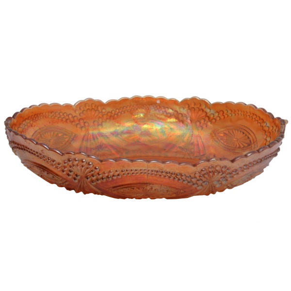 • Saladeira oblonga em vidro artístico iridescente conhecido como Carnival Glass. Borda recortada.