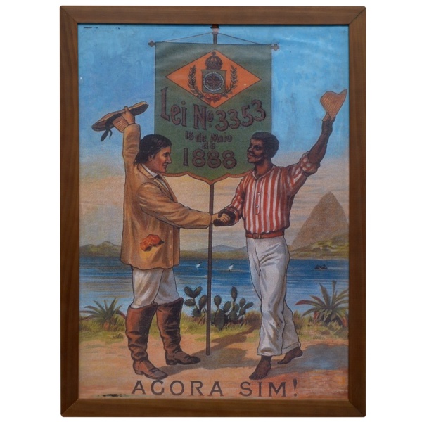 • LEI No. 3353, 13 de Maio de 1888  AGORA SIM !  Cartaz comemorativo que faz referência à Lei Áurea, assinada peça Princesa Isabel tornando o Brasil o último pais das Américas a abolir a escravidão. A cena ilustre a o sentimento popular da época com a frase AGORA SIM, em que mostra um cidadão branco e um cidadão negro se cumprimentando, com uma flâmula da Bandeira do Império do Brasil pelo fim da escravidão no Brasil. 40 x 28 cm (MI). 45 x 32 cm (MT)