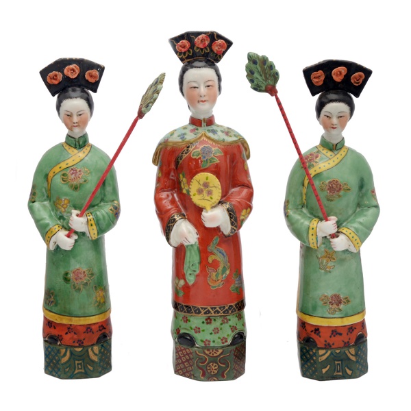 • Conjunto de 3 estatuetas em porcelana chinesa policromada, representando dignatária ladeada por atendentes com grandes leques. Exibem trajes formais, ricamente bordados e belos enfeites de cabelos. Bases quadrangulares chanfradas.42 cm / 43 cm / 40 cm.