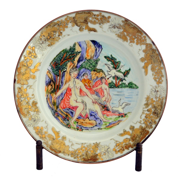 • CHINA. COMPANHIA DAS ÍNDIAS. SÉC. XVIII - Prato em porcelana chinesa da Companhia das Índias, decorado com bordas estilizadas a ouro. Centro apresentando pintura policromada inspirada na cena mitológica de Leda e o Cisne. Prato do séc. XVIII. Cerca de 1740. 28 cm. Prato com o mesmo tema vendido pela Christies London em 2003 da coleção J. Louis Binder.