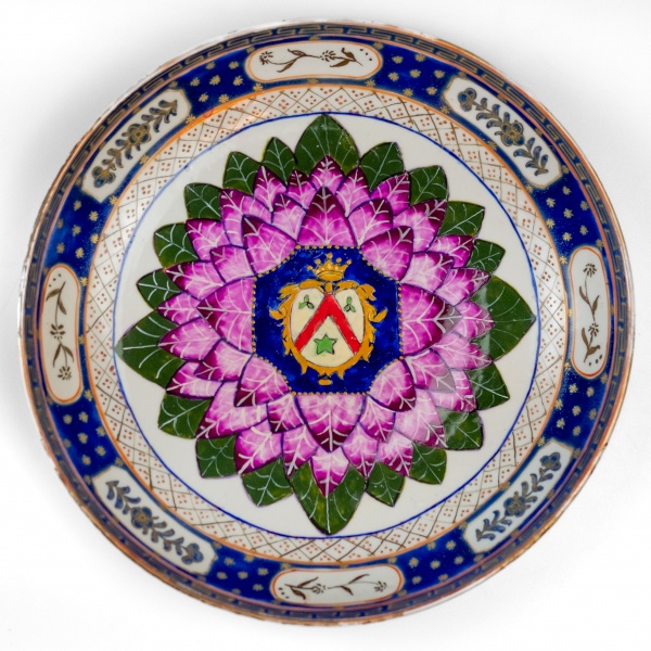 • CHINA. CIA DAS ÍNDIAS. SÉC. XVIII - Prato de porcelana chinesa, Companhia das Índias, ao gosto do oriente médio, com acréscimo de brasão possivelmente inglês radicado na Índia. Centro apresentando flor de lótus e medalhão floral. Decoração feita para o mercado indiano. China. Qing. Reinado Qianlong (1736-1795). 24 cm.