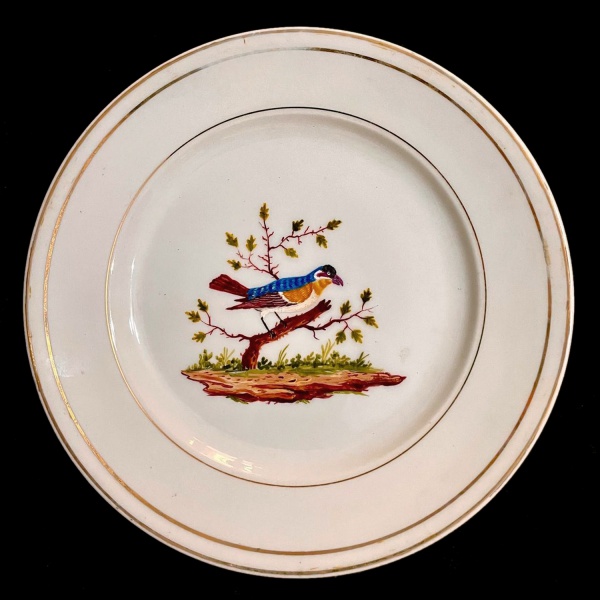 • Prato em porcelana possivelmente francesa. Apresenta formato circular com frisos na borda e representação de pássaro ao centro. Decoração similar ao do Serviço Nast. 25 cm.
