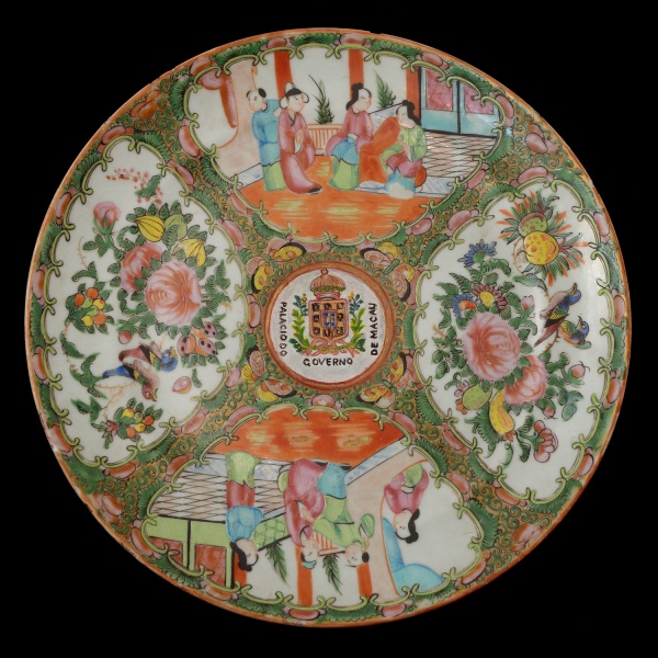 • Prato em porcelana Companhia das Índias com temática histórica. Apresenta uma Vista da cidade de Macau, com paisagem costeira e embarcações. No centro o Brasão de Armas de Portugal com a inscrição Macao na parte inferior.