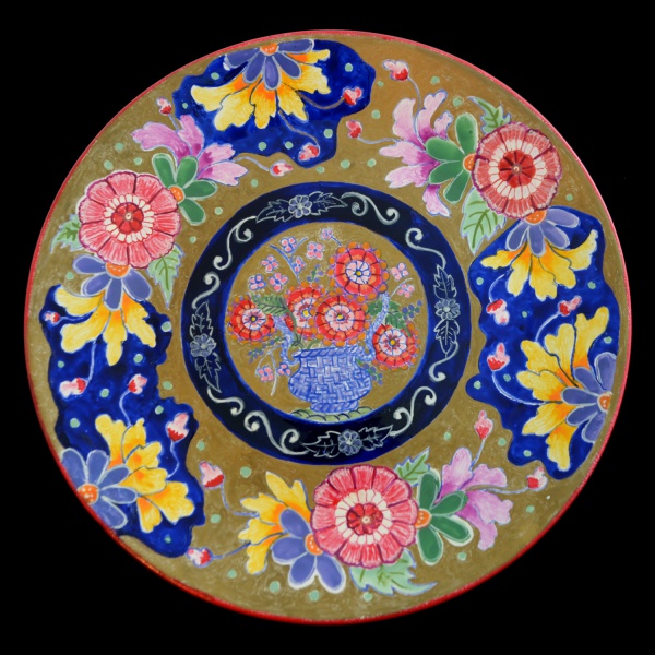 • JAPÃO. Séc. XIX - Prato em porcelana oriental apresentando decoração tradicional com flores ao centro e motivos florais nas bordas. Utiliza uma paleta rica com fundo dourado e bege detalhes em azul profundo, vermelho e amarelo. Pequeno restauro na borda. 26 cm.