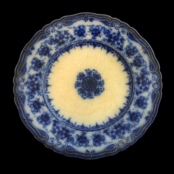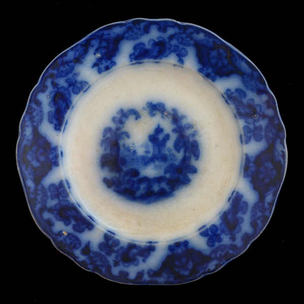 • RIDGWAY POTTERIES, Flow Blue. England - Prato circular em louça inglesa do séc. XIX. Apresenta decoração azul borrão e reserva central com desenhos florais. Marca da manufatura no verso.