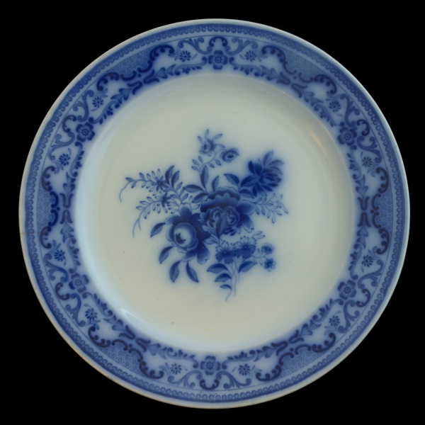 • W. H. GRINDLEY  HARTINGTON. Circa 189 - Flow Blue - Prato raso em faiança inglesa decorado no padrão conhecido como azul borrão. Centro apresentando decoração com flores e folhagens. Marca da manufatura no verso. Livro, Flow .... pág. 190