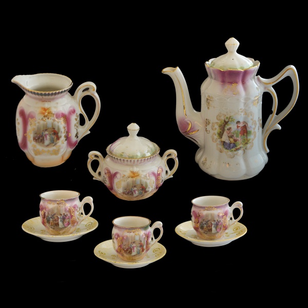 • Conjunto para café em porcelana possivelmente alemã. com 9 peças, possivelmente alemão. Apresenta peças com estilo clássico com cenas românticas pintado nos centros e frisos decorativos. a mão. Constando de: bule p/ café, leiteira, açucareiro e três xícaras com pires