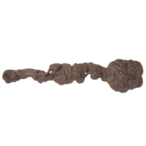 • Cetro chinês Ruyi, em madeira nobre, esculpido a partir de uma raiz de árvore de jardim de templo. Haste profusamente esculpida, de formato alongado e retorcido, realçada por elementos fitomórficos, e rematada por cogumelo Lingzhi, o qual habitualmente cresce no tronco das árvores. Na origem, tais objetos sagrados eram usados somente nas cerimonias budistas chinesas e igualmente por imperadores, como símbolos de poder e longevidade. Posteriormente, se tornaram presentes de alto prestígio, sendo adotados por letrados como descansos para pinceis. Cerca 1800. 36,5 x 7 cm.