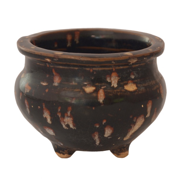 • Raro incensório trípode em porcelana chinesa do tipo Jizhou de pasta clara, com coberta salpicada com manchas de cor bege sobre fundo preto, imitando plumagem de perdiz. Bojo globular com gargalo retraído, e borda revirada e saliente. Província de Jiangxi, sul da China. Dinastia Song (960-1279). Peça de coleção. 7,5 x 9, 5 cm.
