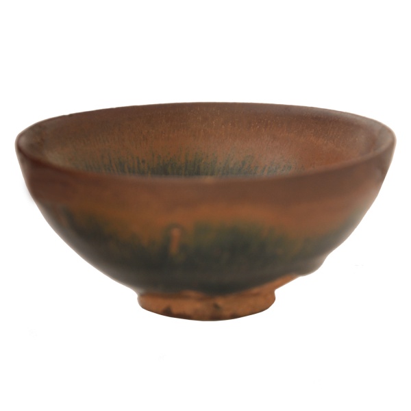 • Raro Bowl chinês bojudo, em "stoneware", cerâmica pedra, do tipo Jian do Fujian, ornamentado por coberta no padrão conhecido como "Hares Fur", com tonalidades mescladas e listradas em bege e marrom sobre fundo preto, imitando pele de lebre. Corpo cônico apoiado em base circular baixa. Fornos do Fujian. Dinastia Song (960-1279). Peça de coleção. 5 x 10 cm.