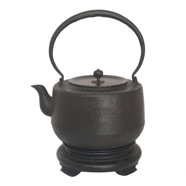 • Tetsubin", chaleira japonesa em ferro, de formato globular achatado, finamente martelada até meia altura e encimada por friso saliente, faixa em gregas e parte superior retraída, com adornos florais estilizados. Alça superior móvel, recortada em arcos. Bico com extremidade recurva. Tampa levemente abobadada, seguindo a decoração, com pega em pinha. Base baixa e arredondada. Assinada pelo mestre Hojudo ou Hojyu-Do (1755- 1831), com 3 caracteres em relevo na parte superior. Final do séc. XVIII/Início do séc. XIX. Acompanha base em madeira. 18 cm (MT com a alça). 11.5 cm (sem a alça). 17 cm (diam).