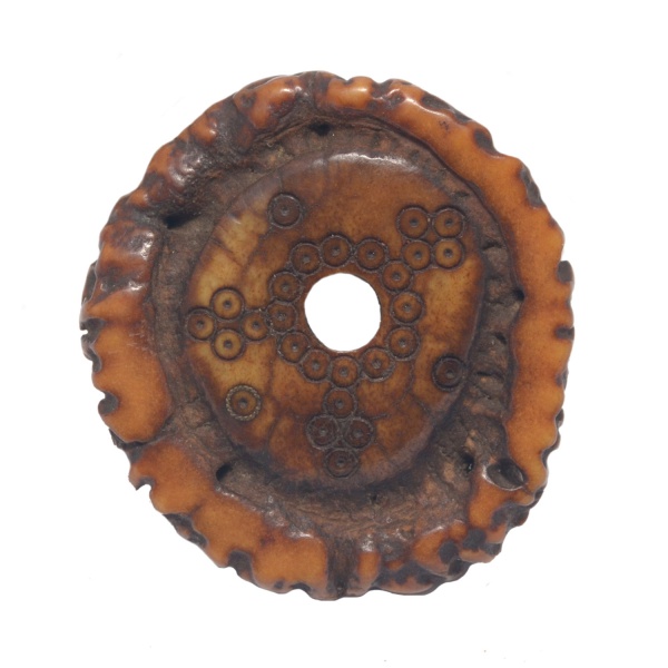 • Séc. XVIII - Netsuke de samurai do clã Minamoto, o qual tradicionalmente usa rodelas de chifre de cervo nos netsuke que acompanham as armaduras dos Wakai Samurai, samurais iniciantes, encarregados de proteger os Jokyu Samurais, samurais chefes, nas batalhas. Tais netsuke são decorados com pequenos círculos, emblema deste clã, sendo este com 3 deles realçados por finos filetes de ouro em torsade, representando o reconhecimento de seus méritos pelo senhor. Peça reproduzida com foto no livro Samurais Netsuke & Inro  ed. Londres - Tóquio 1966. Participou da Exposição Japanese Art em Londres  Setembro de 1968 no Victoria & Albert Museum. 5.0 x 4.0 cm.