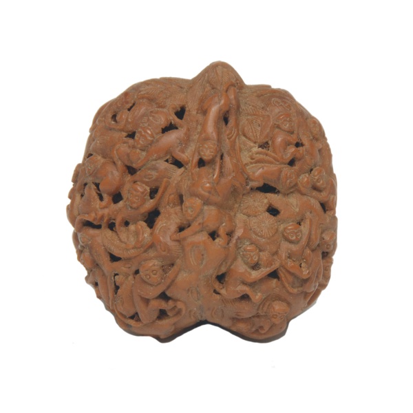 • Séc. XIX - Original e rara pequena escultura do tipo Hediao, antiga arte chinesa de micro escultura em cascas de nozes, azeitonas ou damascos. A presente noz de nogueira exibe não menos de 38 macacos em diversas atitudes, cercados por palmeiras e árvores. Devido ao furo natural no topo da noz, muitos japoneses passaram a usar estas esculturas como netsuke. Porém, devido à fragilidade da casca da noz, estes colecionadores preferiram colocá-los nas suas vitrines com os outros netsuke de vitrine. Lembrando que a partir de 1868, início de período Meiji e da modernização ocidentalizada, as vestimentas de samurais foram proibidas, levando os artistas de netsuke a destinar parte de suas obras para colecionadores. 4 x 4 cm.