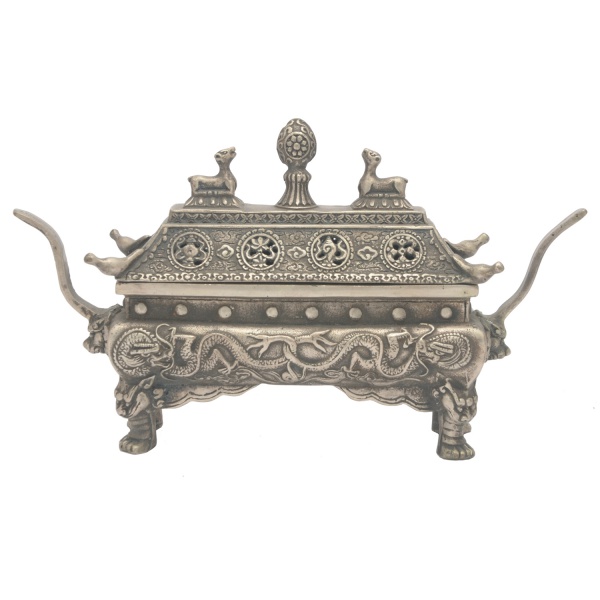 • Incensório sino-tibetano para varetas de incenso, de formato retangular em metal prateado usado em altares. Bojo apoiado em patas com garras, sustentando paredes laterais ornadas em relevo com dragões. Pegas laterais no feitio de cabeças de touro com longos chifres. Tampa com lados inclinados, realçados por medalhões e pequenas pegas com pássaros. Parte superior ornada por par de cabras centralizando pinha. Sob a base, símbolo ritual budista gravado. 14 x 12 x 6 cm.