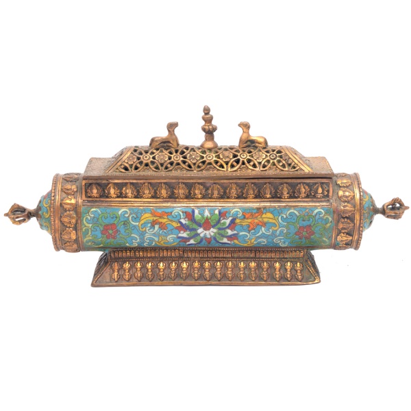 • Incensório sino-tibetano para varetas de incenso, de formato retangular, em metal dourado com realces em esmaltes cloisonnés, usado em altares. Base chanfrada sustentando recipiente cilíndrico, ornado por arranjos florais e adornos estilizados. Extremidades arredondadas e realçadas por adornos simbólicos. Tampa construída com medalhões vazados, encimados por par de cabras centralizando ponteira. 14 x 33 x 7 cm.