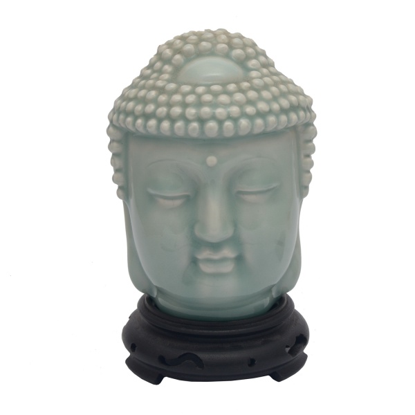 • Escultura em porcelana possivelmente chinesa, revestida por coberta monocromática celadon, representando cabeça de Budha. Acompanha peanha em madeira. 17 x 13 x 12 cm.