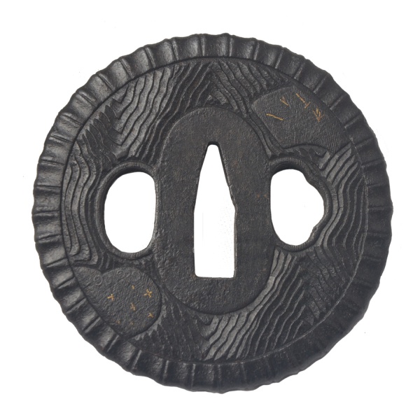 • Final do Período Momoyama (1573-1603) / Início do Período Edo (1603-1867) - Antiga e original tsuba em ferro carbono forjado, de formato marugata, praticamente circular, lavrada no formato de roda de carro de boi. Apresenta delicados veios da madeira finamente esculpidos, ornamentados por reservas com delicados zogan, adornos geométricos, embutidos em prata e ouro. O mimi, a borda externa, reforçada por faixa martelada com gomos alinhados. Final do Período Momoyama (1573-1603) / Início do Período Edo (1603-1867). 7.5 x 7 cm