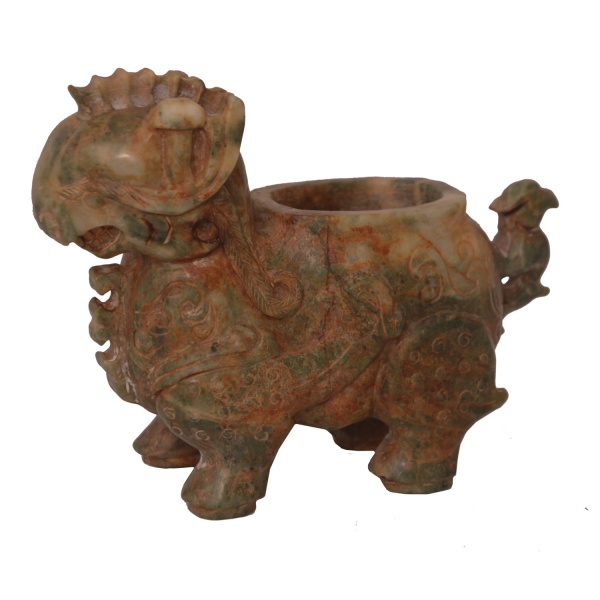 • Raro e antigo incensório chinês em jade mesclado, profusamente esculpido no formato de Pixiu, animal mítico, ornado em alto relevo por símbolos e adornos estilizados, e cauda no formato de fênix. Apresenta-se de pé com a boca aberta e as costas escavadas. Possíveis infiltrações de outros minerais.11,5 x 14,0 x 5,0 cm.