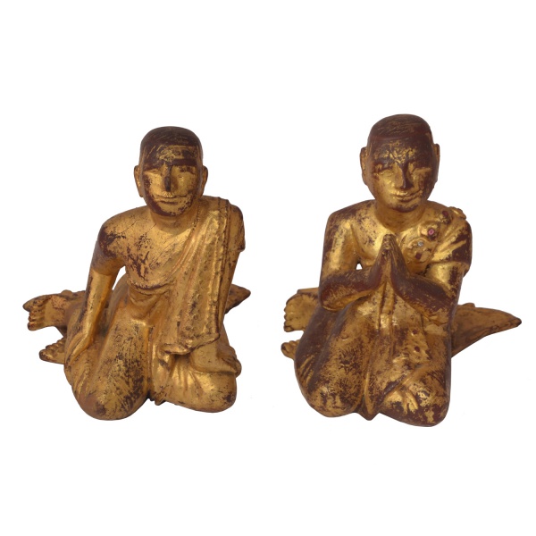 • Raro par de estatuetas birmanesas do século XVIII, esculpidas em madeira revestida por folhas de ouro sobre fundo em laca rouge de fer. Apresentam monges budistas ajoelhados de lado, vestindo Kasaya, longos mantos monásticos, realçados por poucos adereços como colares montados com pedaços de vidro espelhados. São raros os do século XVIII. Os do século XIX são muito mais decorados com grandes áreas cobertas por mosaicos em vidros coloridos. 22 x 20 x 22 cm.