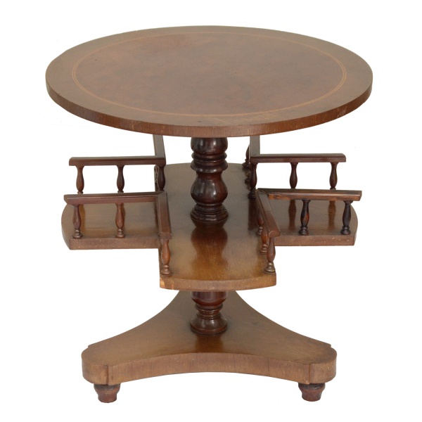 • Mesa em madeira nobre, estilo inglês, com tampo circular liso. Coluna central reta e anelada, sustentando à meia altura 4 pequenas prateleiras para livros, bordadas por delicados balaústres. Plateau inferior de formato triangular apoiado em pés baixos. 62 x 60 cm. Sinais de uso e do tempo, com pequenos bicados nas quinas.