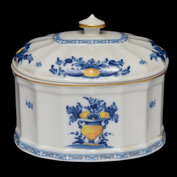 • Caixa para chá em cerâmica portuguesa, da manufatura Vista Alegre. Apresenta decoração em azul com laranja. 12 x 15 x 12 cm.
