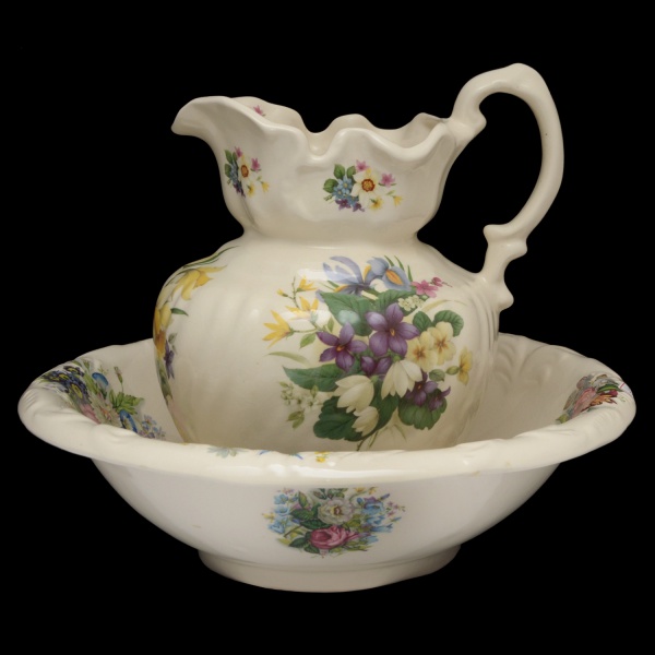 • Jarra e bacia em louça inglesa policromada. Fundo de superficie claro com decoração floral. 10 x 37 cm (bacia). 29 x 24 x 22 cm (jarro)