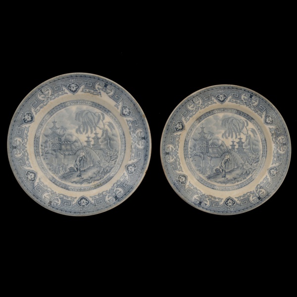 • YEDOO U & CO. SARRAGUEMINES - Conjunto de 2 pratos em louça inglesa. com decoração em azul e branco. 20 cm. Apresenta bicados e fios de cabelo. No estado.