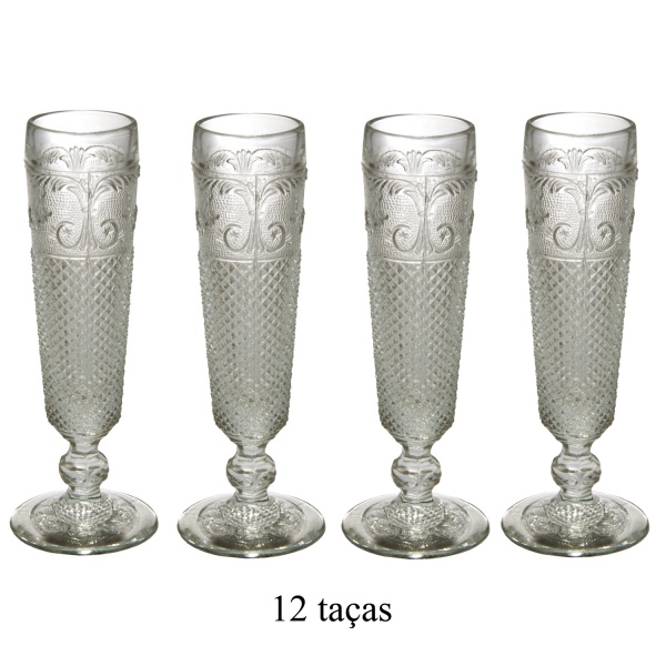 • Conjunto de 12 flutes em vidro no padrão bico de jaca. 20 cm.