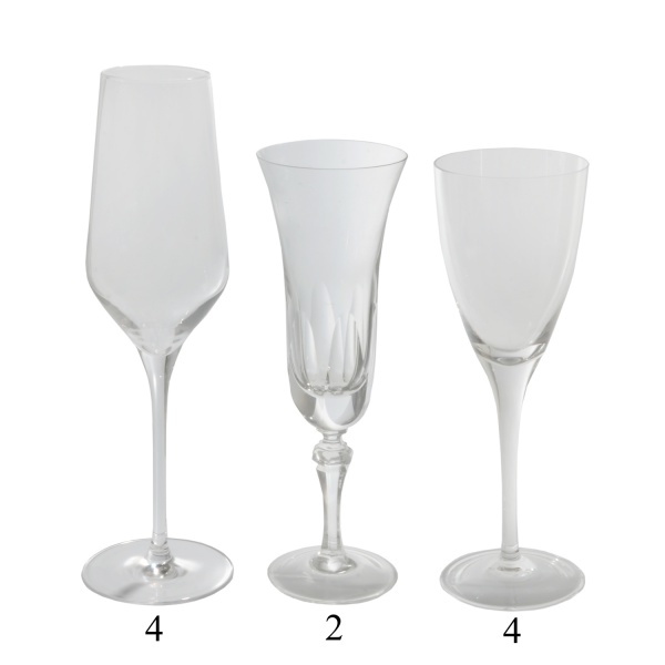 • Conjunto de 12 taças de modelos diferenciados, sendo: 4 flutes lisos (20 cm) e 2 leve taças (20 cm) e 4 taças (24 cm).