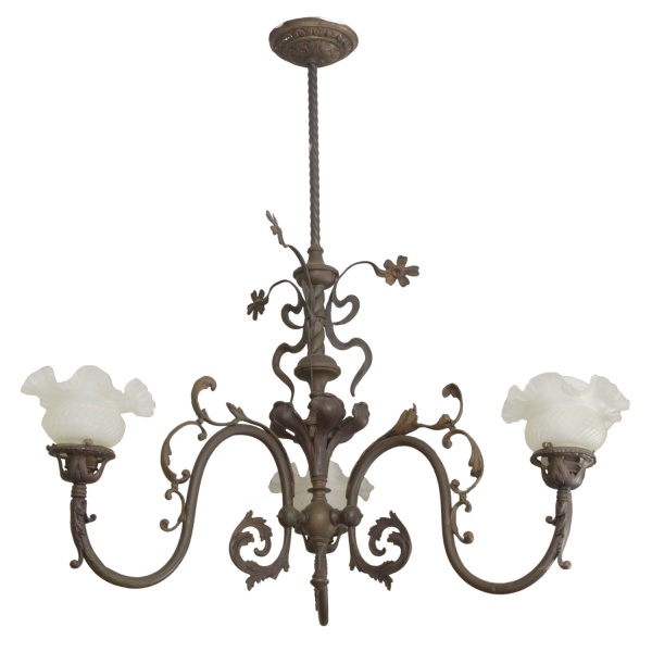 • Lustre para 3 velas em bronze patinado. Coluna central ornamentada por galhos floridos e volutas. Braços laterais recurvos, acompanhando o estilo, rematados por tulipas bojudas com bordas reviradas e onduladas. Haste superior reta rematada por canopla circular.
