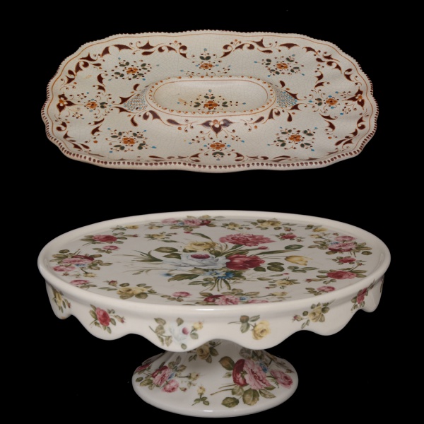 • Conjunto de 2 peças em cerâmica, pintado, sendo: A) Petisqueira de formato retangular com cantos arredondados (15 x 20 cm). B) Doceira circular de pé alto com intensa decoração floral. (10 x 15 cm)