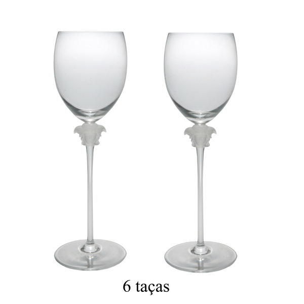 • ROSENTHAL Design da MAISON VERSACE. Modelo Medusa Lumiére  Conjunto de 6 taças em cristal transparente com motivo de cabeça de Medusa em alto relevo. Peças assinadas e sem uso. 28 cm.