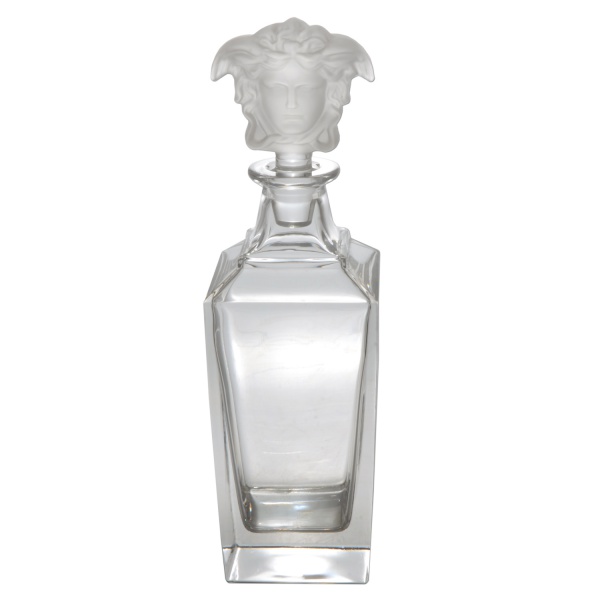 • ROSENTHAL Design da MAISON VERSACE. Modelo Medusa Lumiere  Decanter em cristal translucido de formato quadrangular. Tampa na forma de máscara acetinada da marca da grife. Peça assinada e sem uso. 31 x 9 x 9 cm.