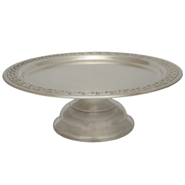• GIANNI VERSACE - Centro de mesa ou suporte para bolos e doces em silver plate Apresenta o característico padrão Greek Key (chave grega) em sua borda.11 x 32 cm.