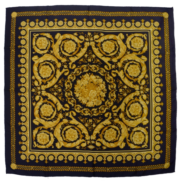 • ATELIER VERSACE  Lenço de seda (foulard) da renomada marca italiana Versace. Apresenta a icônica estampa Barroca em tons de preto e dourado. O design é caracterizado por elementos clássicos da marca, como arabescos, volutas e a imagem central da Medusa  80 x 86 cm.