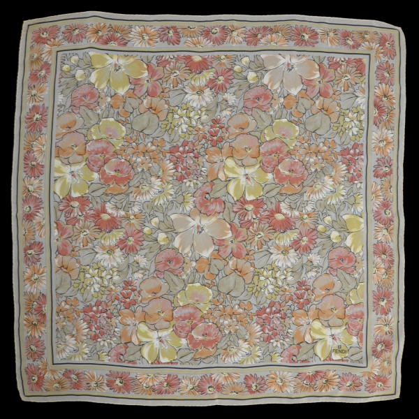 • FENDI - Lenço de seda (foulard) da renomada marca FENDI. Apresenta padrão floral denso e detalhado em tons terrosos, como laranja, amarelo e bege com folhagens verde.o design apresenta uma borda decorativa que enquadra o arranjo central de flores. 82 x 80 cm.