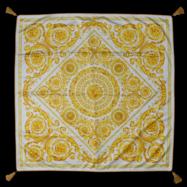 • ATELIER VERSACE  Manta representando a clássica estampa Barroco em tons de amarelo e dourado sobre fundo claro. Confeccionado em seda pura ou misturas luxuosas de seda e modal. Dependendo do tamanho e acabamento (como a presença de franjas ou bordas enroladas), pode ser utilizado como lenço de pescoço, xale ou até mesmo como um item decoração para casa. 136 x 136 cm.