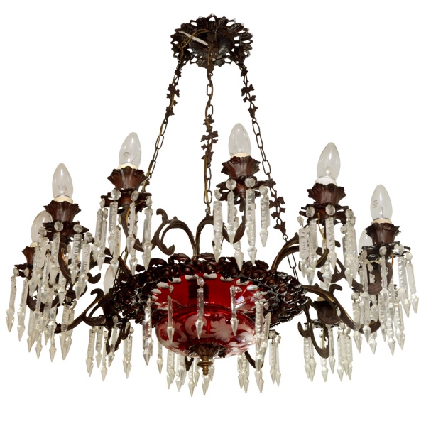 • Importante lustre para 12 luzes em bronze e cristal. Cúpula inferior ornamentada em overlay de cor rubi com adornos florais, bordada por pingentes lapidados e rematada por coroa com borda dentada sustentando braços recurvos. Bobeches cônicas, apoiadas em pequenos pratos realçados por ponteiras facetadas e encimadas por velas. Correntes superiores reunidas ao topo por canopla circular vazada.70 x 70 cm. Falta pequeno pedaço do suporte de encaixa da peça de cristal.