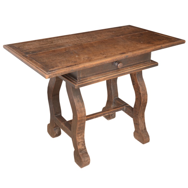 • Séc. XIX - Mesa rústica com tampo retangular saliente, bordado por canelado. Caixa retangular, apresentado gavetão almofadado à frente apoiado em frisos superpostos e proeminentes. Base em lira com pernas largas recortadas em S e reunidas por travessão reto. 78 x 110 x 82 cm. Sinais de uso e do tempo.