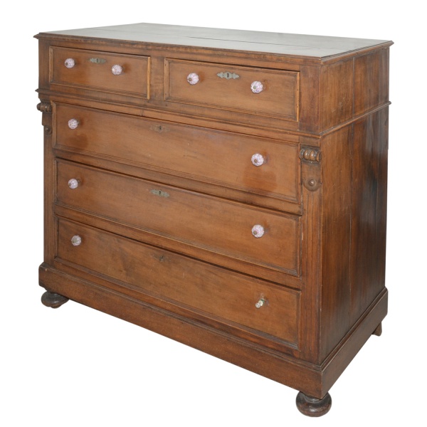 • Brasil. Séc. XIX - Cômoda brasileira em madeira nobre, de formato retangular. Tampo liso, bordado por friso saliente, apoiado em caixa reta. Apresenta frente com par de gavetas alinhadas sobre discreta moldura, com 3 gavetões superpostos na parte inferior. Laterais ornadas por colunatas com capiteis esculpidos em alto relevo. Base retilínea apoiada em pés de bolacha. Puxadores em vidro moldados com gomos. 107 x 116 x 63 cm. Falta 1 puxador e 2 espelhos de chave. Sinais de uso e do tempo.