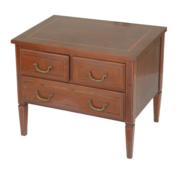 • Pequena meia cômoda em madeira nobre, estilo inglês, ornada por frisos em parqueterie. Tampo retangular liso e saliente, apoiado em caixa reta. Frente apresentando par de gavetas alinhadas sobre gavetão. Pernas retilíneas, de secção quadrangular, levemente afinadas. 50 x 60 x 40 cm. Sinais de uso e do tempo, com algumas manchas no tampo.