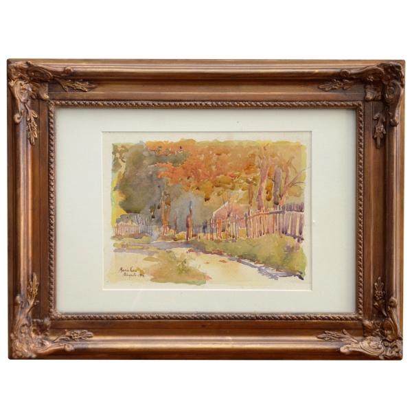 • ANA DA CUNHA VASCO (Rio de Janeiro, 1881 -1 938) Paisagem Rural com Tons Quentes de Outono. Aquarela. Ass, localizado e datado, Petropólis, 19..., cie. 18 x 24 cm (MI). 35 x 46 cm (ME). Pintora e desenhista brasileira do início do século XX. Irmã da também pintora Maria Vasco (1879-1965). Estudou aquarela e pintura ao ar livre com o professor alemão Benno Treidler por volta de 1897.Devido a problemas de saúde, não podia usar óleo e se dedicou principalmente às aquarelas (paisagens, especialmente do bairro do Leme, no Rio de Janeiro  por isso às vezes chamada de "aquarelista do Leme". Participou de várias edições da Exposição Geral de Belas Artes (1898 a 1908), recebendo prêmios como Menção Honrosa (1898 e 1904) e Medalha de Prata (1905).