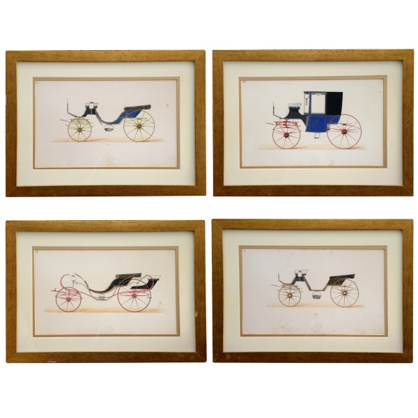 • DESOUCHES S. DE TOUCHARD. Paris. Carruagens Francesas Private Drag. Coleção de 4 Aquarelas ricamente detalhadas. Circa de 1850. Apresenta cache do artista. 17 x 27 cm (MI). 30 x 40 cm (ME).
