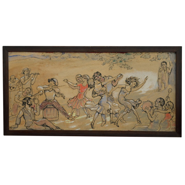 • HELIOS SEELINGER (Rio de Janeiro, 1878 - 1965)  Cena Festiva, Dançarinos em Baile Popular. Ass. cid. 17 x 36 cm (MI). 40 x 20 cm (ME). Pintor, desenhista, caricaturista. Forma-se na Escola Nacional de Belas Artes (Enba) entre 1891 e 1896, e freqüenta também o ateliê dos irmãos Henrique Bernardelli (1858-1936) e Rodolfo Bernardelli (1852-1931)