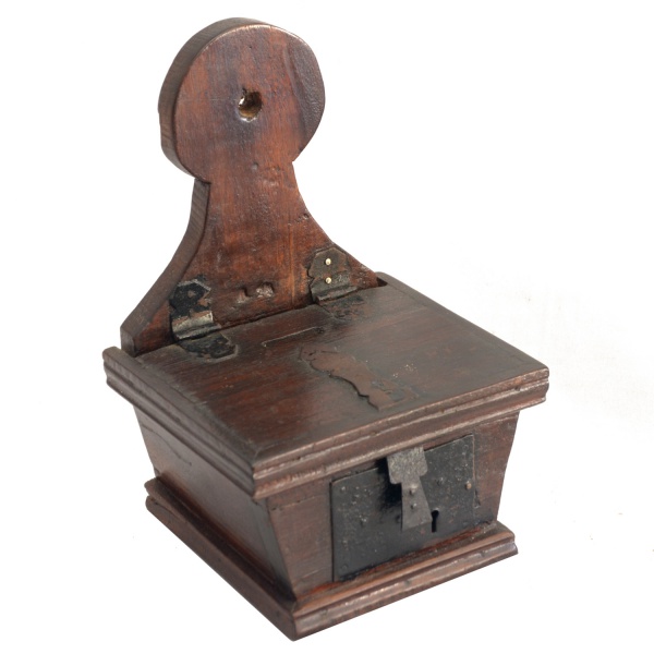 • Brasil. Séc. XVIII - Esmoleira das Almas em madeira lisa, de formato retangular com laterais levemente inclinadas. Bordas duplas e caneladas centralizando grande fecho em ferro. Suporte superior recortado em corneta e encimado por adorno circular. 30 x 20 x 18 cm.
