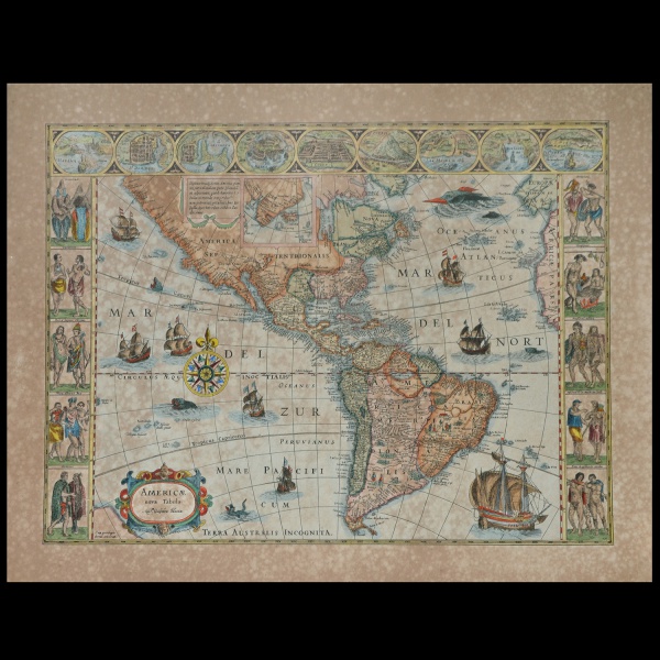 • AMERICA NOVA TABULA por Guilgelmo Blaeuw (1571-1638) - Mapa das Américas a cores, ladeado por indígenas e encimado por paisagens locais. A edição original data de 1641-1649, e foi editada em Amsterdã. Marcas de oxidação. 51 x 66 cm.