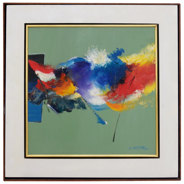 • KINYA KIMFA IKOMA (Mieken, Japão, 1918  Bauru, São Paulo, 2002), - Abstração. Óleo s/ eucatex.  Ass. cie. Ass, datado e numerada 1992, no verso. Registro no. 1818. 52 x 52 cm (MI). 71 x 71 cm (ME).  Pintor japonês, radicado no Brasil.